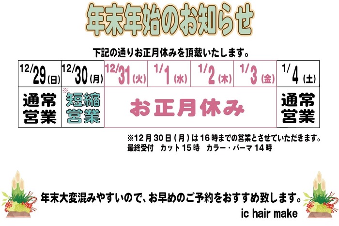 いつもICをご愛顧いただきありがとうございます。 誠に勝手ながら、下記の期間を年末年始のお休みとさせていただきます。 ◎12月31日(火)〜1月3日(金) 通常、月曜日はお休みをいただいておりますが12月30日(月)は営業時間が16時までの短縮営業をしています 最終受付・カット15時・カラー、パーマ14時 1月4日(土)からは通常営業となります また、年末年始は混みやすくなっておりますのでお早めのご予約をおすすめします ご不便をおかけいたしますが、何卒ご理解のほどお願い申し上げます