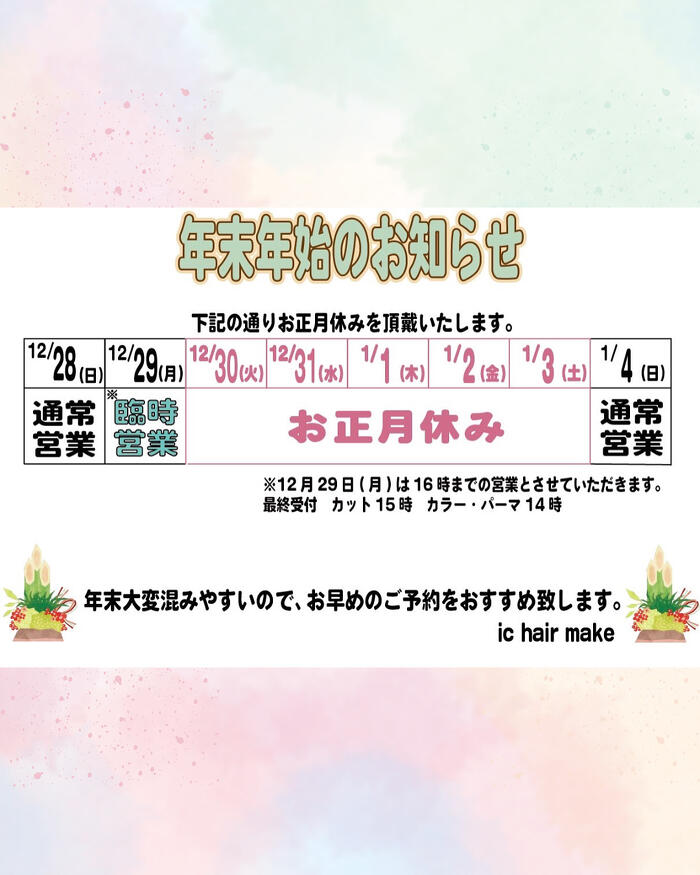 年末年始は営業日は下記の表のとおりご案内しております。 すでに12月のご予約を多くいただいております。 ご予定が分かる方はお早めのご予約をおすすめいたします。 皆様にはご不便をおかけしますがよろしくお願いします。