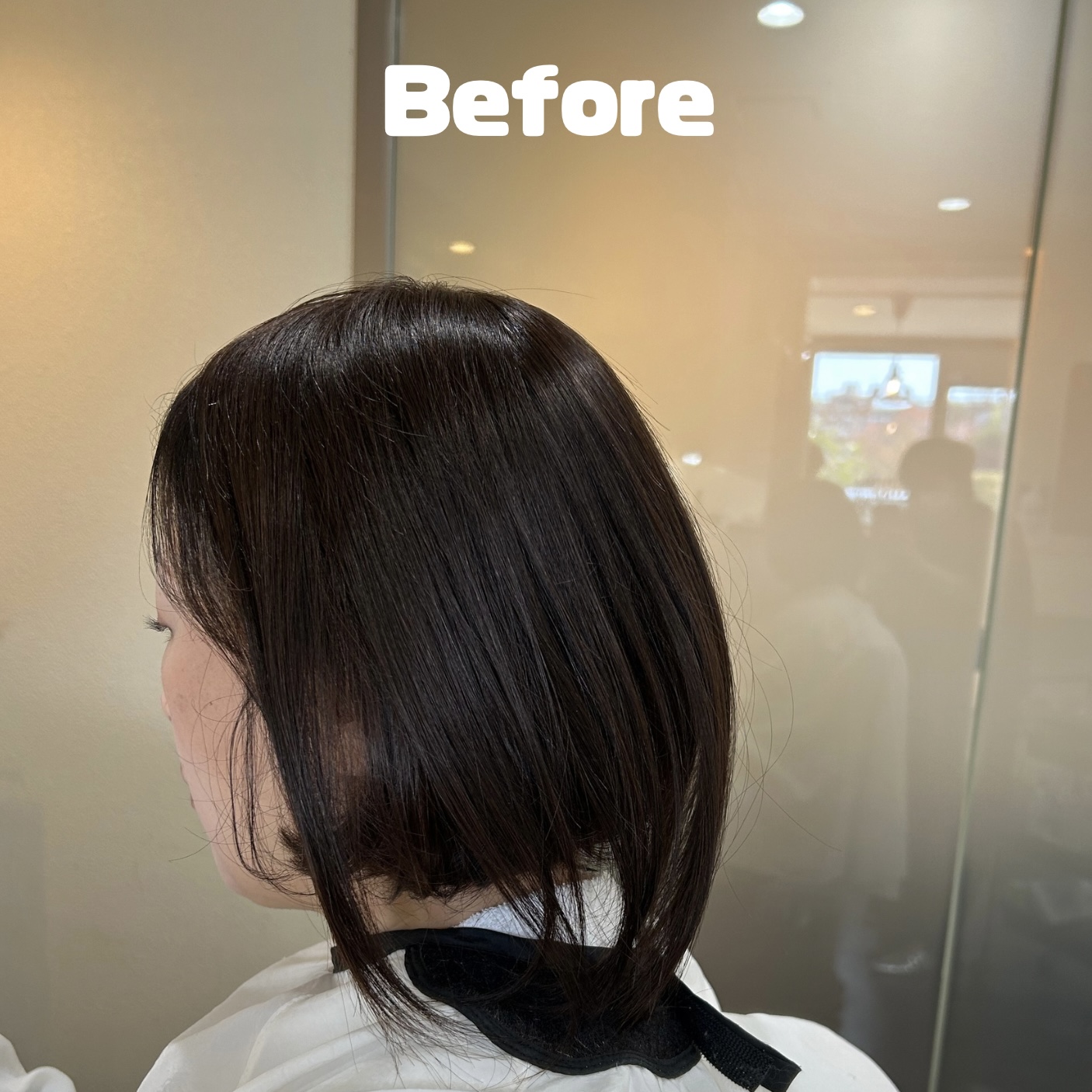 治療後に伸び始めた自毛に合わせて トップピースを自然になじむ長さと質感にカットしました。 気になるトップの薄さもふんわりカバーします。 日常でも気軽にかぶれるよう これから伸びていく合ったスタイルです。