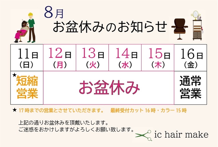 いつもICをご愛顧いただきありがとうございます。 誠に勝手ながら、下記の期間をお盆休みとさせていただきます。 ◎8月12日(月)〜15日(木) また、11日(日)は営業時間が17時までの短縮営業とさせていただきます。 最終受付・カット16時・カラー、パーマ15時 16日(金)からは通常営業となります。 ご不便をおかけいたしますが、何卒ご理解のほどお願い申し上げます。