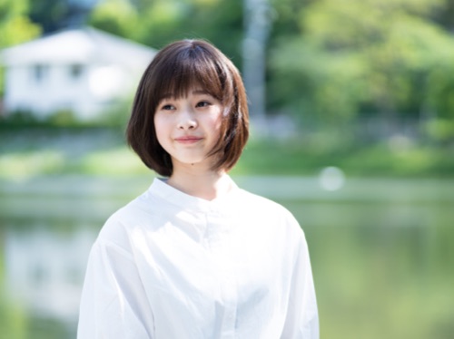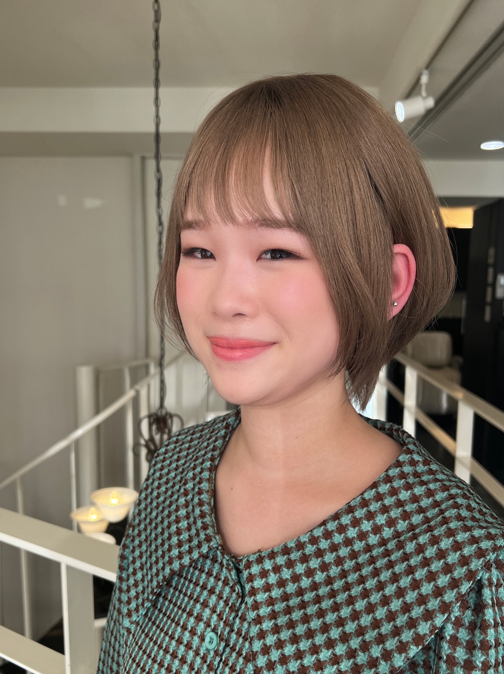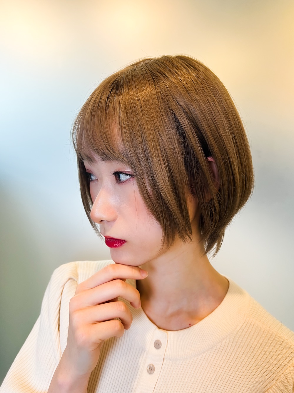 治療後、全体的に髪の長さはのびてきたがトップの髪がまだ短い状態。トップピースをつけることで自然なショートボブのスタイルに。